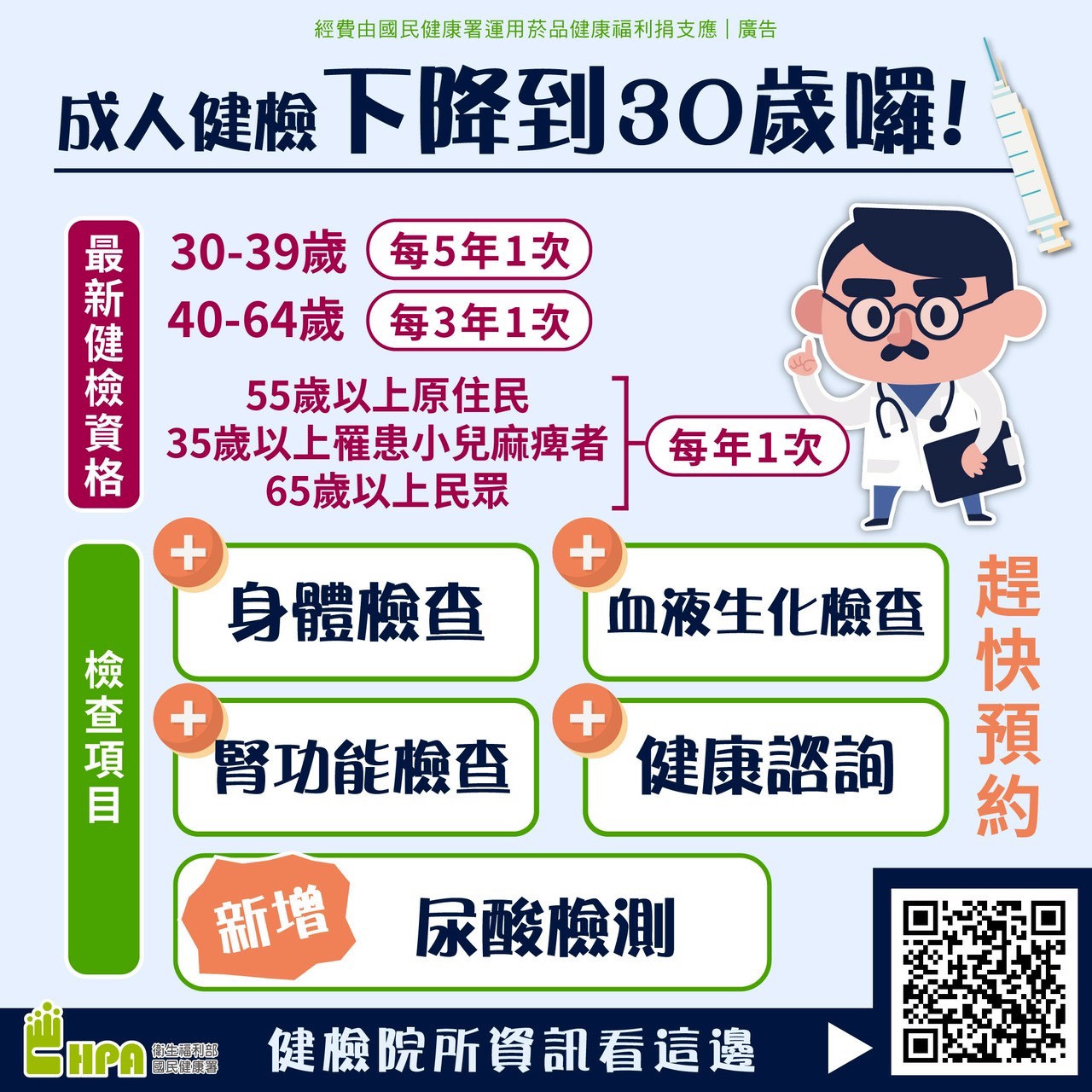 7.成人預防保健服務:【30-39歲每五年一次】、【40-64歲每三年一次】、【65歲以上、55歲以上原住民、35歲以上小兒麻痺患者每年一次】
