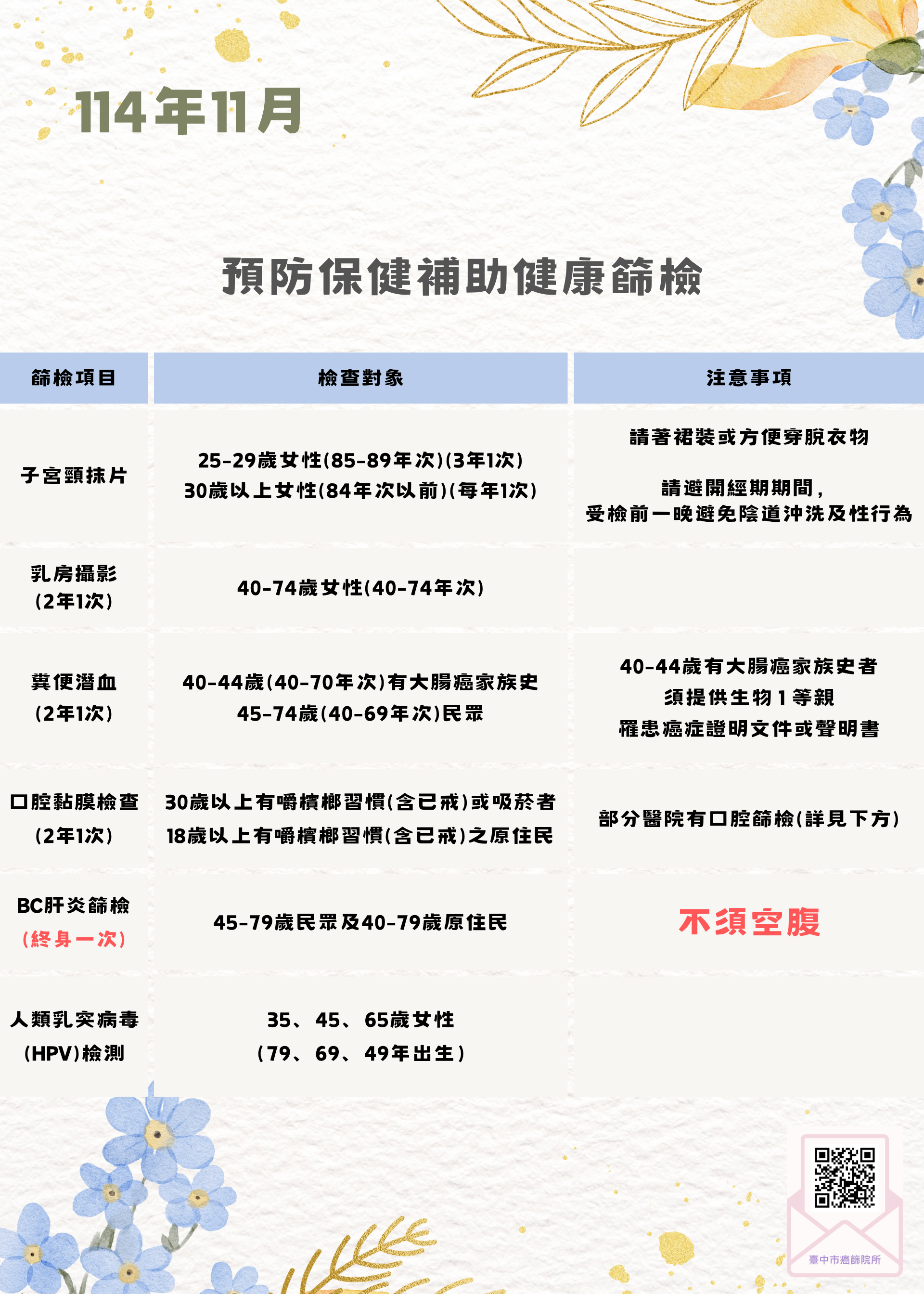 114年11月份癌症篩檢活動場次